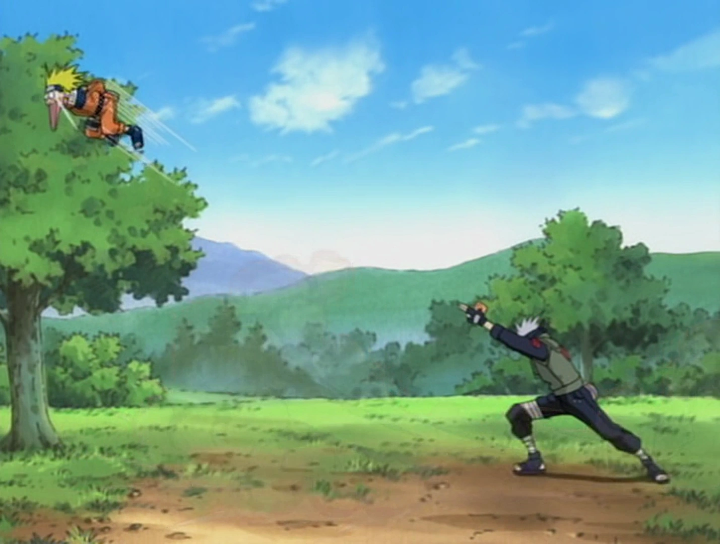 Waktu Naruto lalu melihat bel terdapat pada bawah pohon di dekatnya, beliau jatuh ke perangkap yang dibuat oleh Kakashi, meninggalkan beliau tergantung terbalik. Kakashi mengambil bel serta ceramah pada Naruto ihwal jatuh pada perangkap yang jelas. Di saat itu, Sasuke menyerang senseinya menggunakan shuriken dan pisau kunai, yang tampaknya membunuh Kakashi.