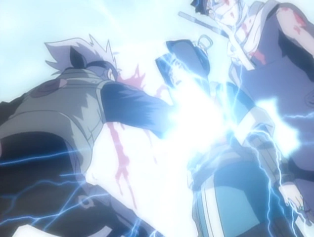 Di jembatan, Kakashi sudah mengimobilisasi Zabuza denganNinken miliknya dan mempersiapkan Pemotong Petirmiliknya menjadi serangan terakhir.